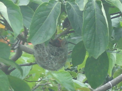身体が隠れていますが巣の右上に、親鳥が顔を出しています。 オレンジ色の口をあけているのが雛です。 雛は4匹。 右下の枝に紐が掛かってますが、その紐にも丸いキラキラ光るCD板が吊り下げて あります。カラス避け。(2005年夏 撮影)